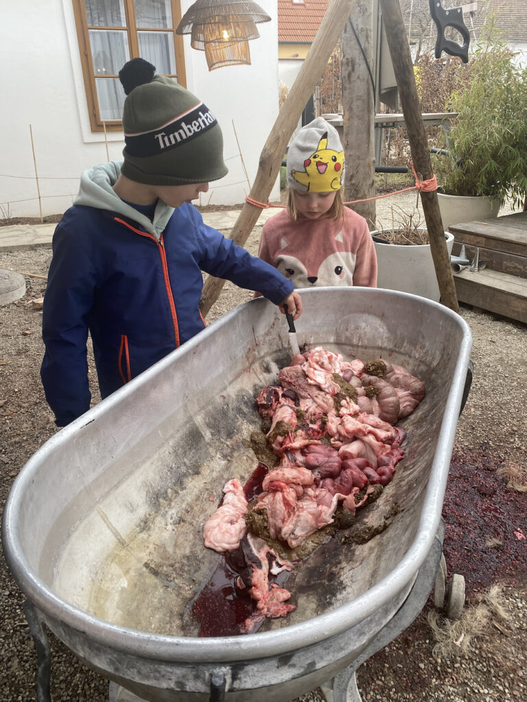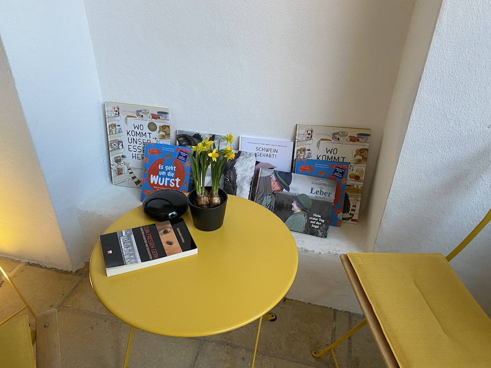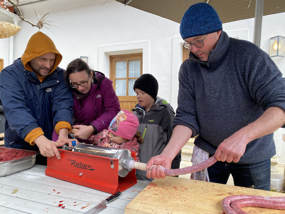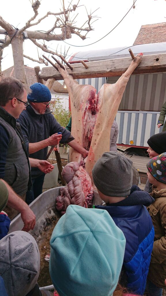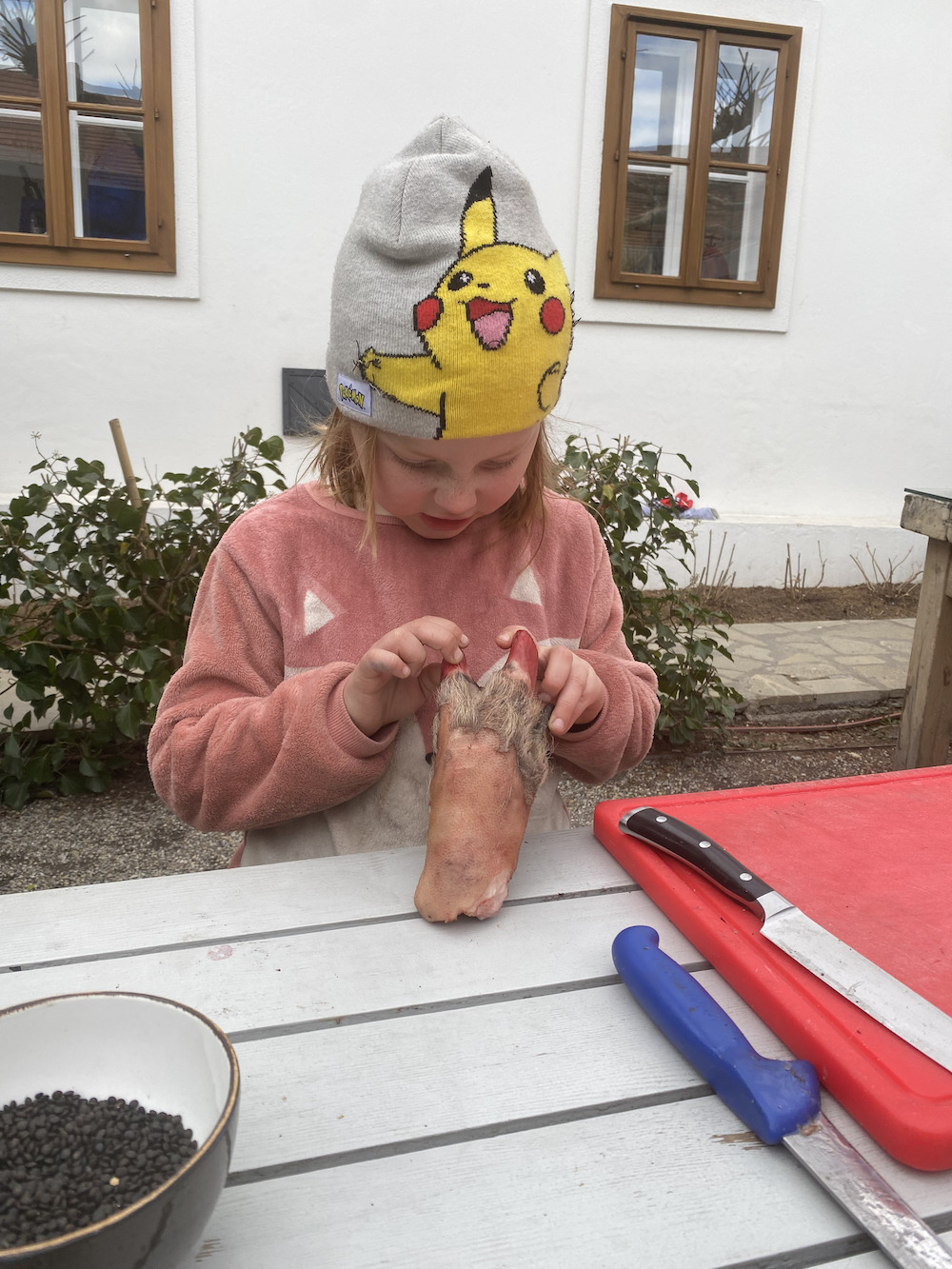 Ich hatte ein großes Programm mit … das ich recht bald über den Haufen geworfen habe. Erstens hatte ich es mit ernährungspädagogischen Profis zu tun, zweitens waren die Teilnehmer*innen auch in Nachhaltigkeitsthemen schon sehr tief eingearbeitet und vor allem drittens nutzten wir die Gelegenheit für den Austausch: Wir diskutierten uns von der Klimawirksamkeit der Rinderhaltung über die wirtschaftlichen Abhängigkeit vom Preisdiktat des LEH über das Fairtrade-Zertifizierungssystem bis zur Produktion von Laborfleisch kreuz und quer durch viele Baustellen der nachhaltigen Ernährung. Die beiden Seminarbäuerinnen und Manuela Hager ließen uns tief ins System (Bio-) Landwirtschaft blicken, einer der zukünftigen Ernährungspädgagog*innen beflügelte uns mit philosophischen Überlegungen, die erfahrenen Pädagog*innen steuerten inspirierende Erfahrungen aus ihrem Unterricht bei.